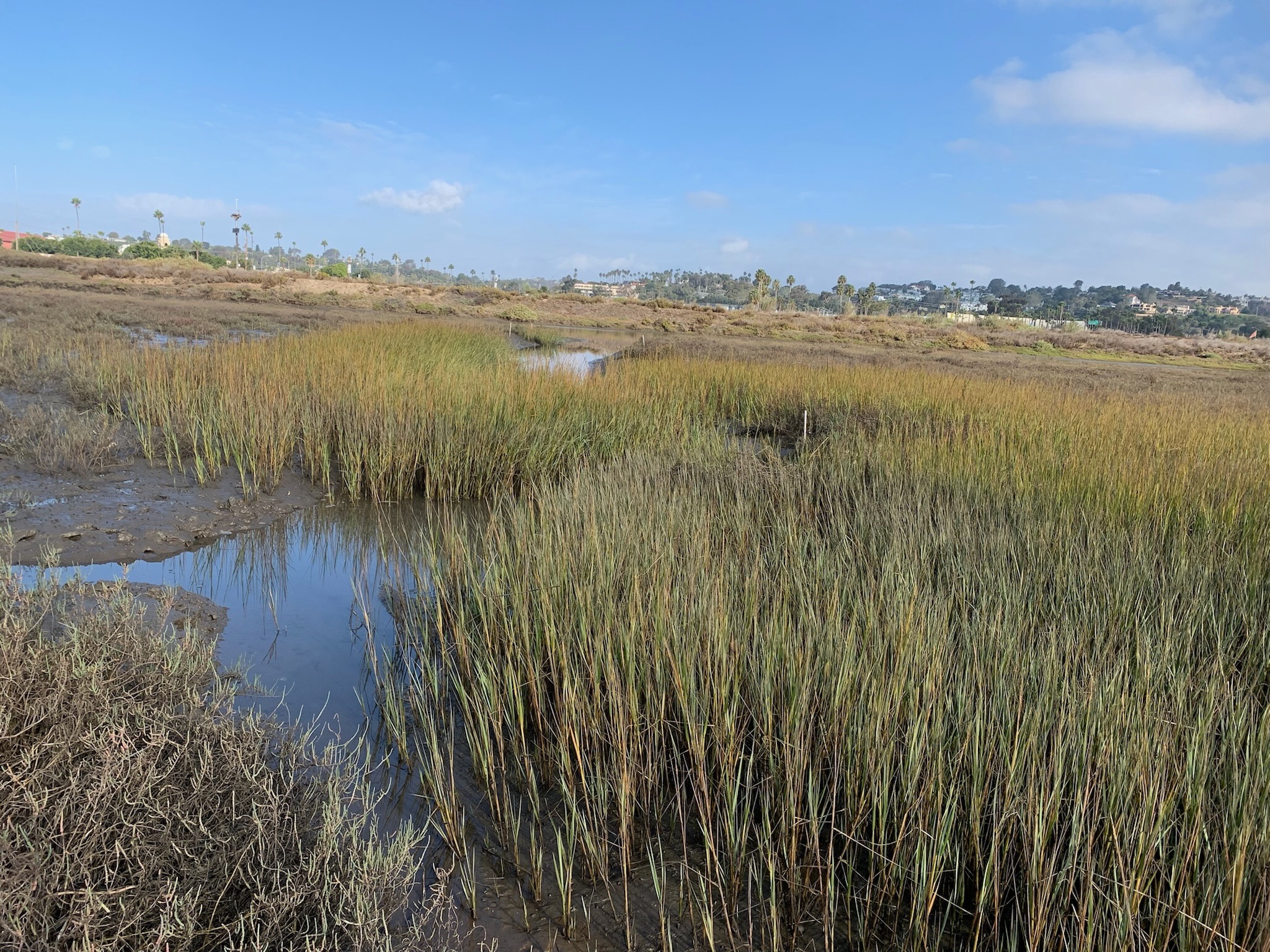 Researchers investigated native Spartina encroachment into areas originally planned as tidal creek or mudflat habitat at the restored San Dieguito Wetlands. Detailed measurements were taken before, during, and after wetland reconstruction using aerial imagery and elevation and vegetation surveys. The restoration project was partially successful but there were some surprising results. Transplanted Spartina grew beyond its planned elevation range and into lower elevation areas, converting 42% of built tidal creek and mudflat habitat to salt marsh. This rapid and dense coverage likely occurred due to a variety of factors, including clonal growth, high local seed supply, and the ability of Spartina to trap sediments, elevating the area and creating suitable salt marsh habitat through positive feedback. The built tidal creeks likely were also insufficiently excavated—which made them unable to maintain their geomorphology as tidal creeks. These findings emphasize the importance of considering wetland hydrology and project design elevations relative to site-specific elevation ranges of desired wetland species. Although salt marshes provide valuable ecosystem services such as nesting habitat for the endangered Ridgway’s Rail, salt marsh encroachment can interfere with shorebirds that feed in mudflats and fish and invertebrates that rely on tidal creeks for passage. Given the trade-offs between habitat types, managing encroachment requires a better understanding of site-specific elevation ranges and wetland hydrology. At this study site, tidal creeks could be deepened to match conditions that do not support salt marsh growth. Source: Smith, R.S. et al. 2025. Habitat Conversion by Native Spartina Highlights the Importance of Wetland Restoration Design Relative to Site‑Specific Vertical Range of Vegetation. Estuaries and Coasts. DOI: 10.1007/s12237-025-01576-3 Image: Tidal creek at the San Dieguito Wetlands / Kathryn Beheshti |